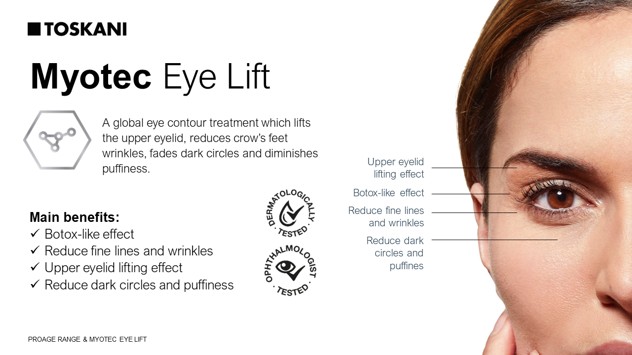 Eine globale Augenkonturbehandlung, die das Oberlid anhebt, Krähenfüße reduziert, Augenringe und Schwellungen mildert.